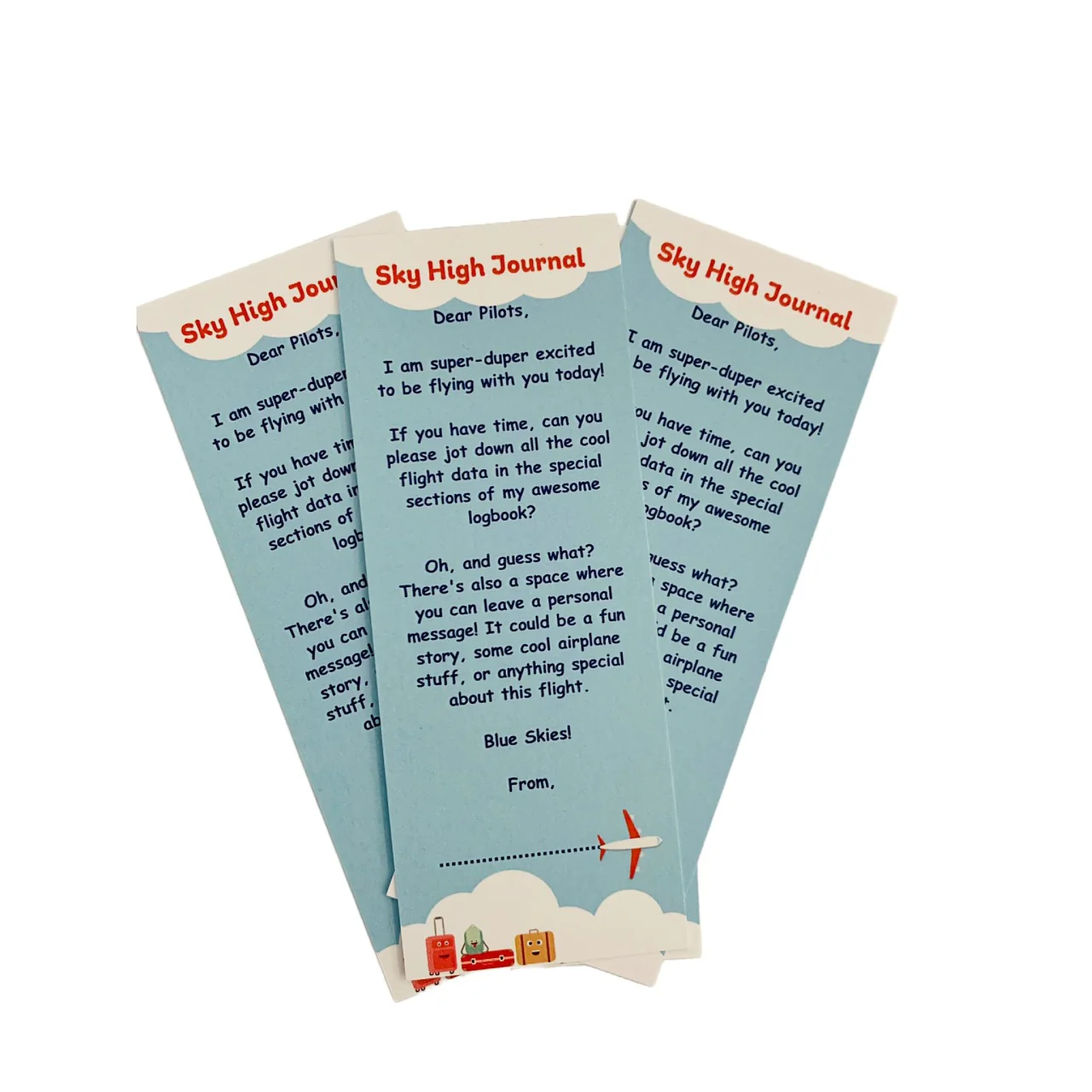 The Sky High Journal Bookmark is more than just a placeholder, it’s a symbol of exploration and connection. Designed to pair perfectly with the Sky High Journal, this sturdy bookmark features a touching message for pilots and encourages shared logbook moments between children and crew.